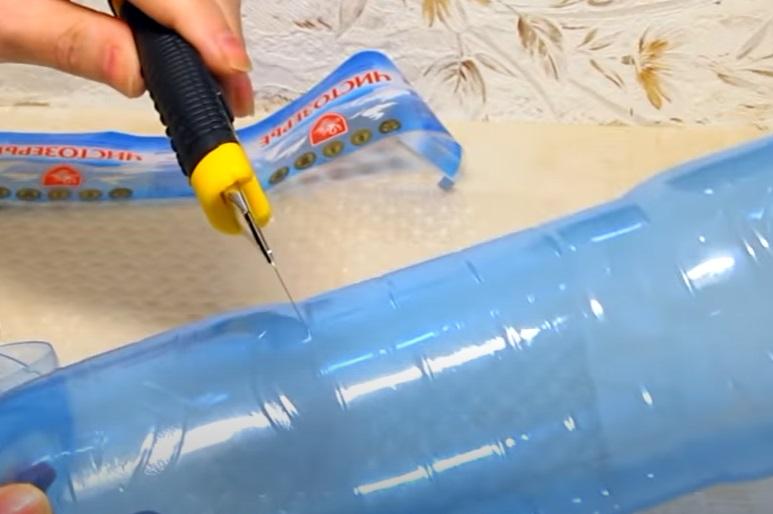- В местах сужения бутылки намотайте декоративный скотч. Между двумя его краями емкость должна быть без неровностей. Разрежьте бутылку ножом по отмеченным линиям. Отложите верхушку и дно бутылки, т. к. использовать их в поделке не будете.