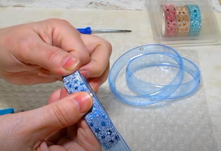 - Оберните еще одно кольцо, и украсьте пайетками. Другие кольца нужно оборачивать лентами другого оттенка. При этом украшения больше не потребуются.