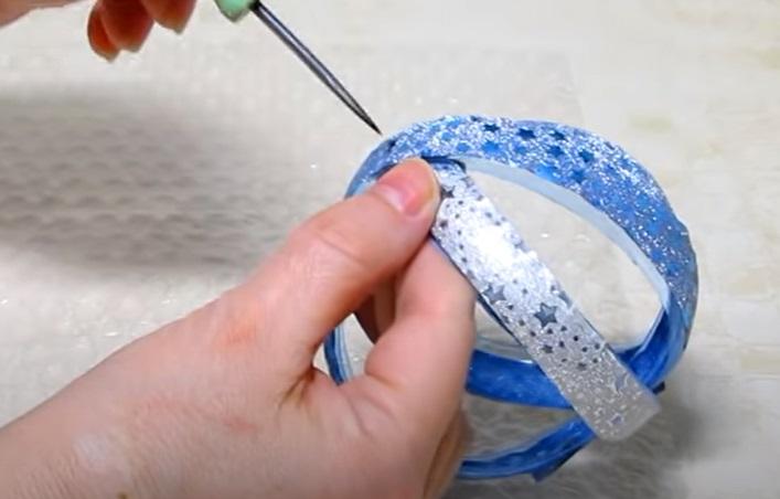 - В точке пересечения приклейте ленту, и сформируйте из нее красивый бант. Также потребуется сделать петлю, чтобы можно было подвесить игрушку на елку.